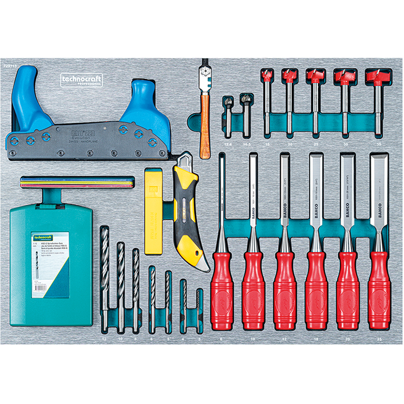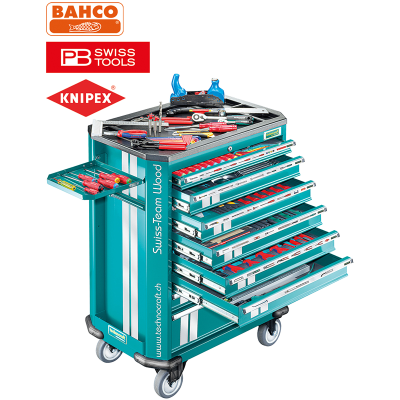 Werkstattwagen "SWISS TEAM WOOD" bietet für den Holzverarbeiter alles was sein Herz begehrt, jedes Werkzeug hat seinen festen Platz in den hochwertigen CNC-gefrästen Schaumstoffschalen, die Kunststoffabdeckung vereinfacht die Reinigung und erhöht die Lebensdauer der Schaumstoffschalen, der Werkstattwagen hat 8 Schubladen wovon 5 mit Schalen bestückt sind und in einer Schublade hat es noch lose Werkzeuge, zwei Schubladen bieten noch viel Platz für eigene Werkzeuge und Verbrauchsmaterialien, der Wagen hat Einzelschubladenverriegelung, es kann nur eine Schublade auf einmal geöffnet werden, dies verhindert das Kippen des Werkstattwagens, einklappbarer Seitentisch, Papierrollenhalter, zwei Spraydosen-Halter, Stossschutzkanten, robuster Handgriff, extra leise Rollen aus TPR Kunststoff, inkl. 3 Schlüssel, Rohling SILCA BMB 5, kann beim Schlüsselservice kopiert werden, mit Qualitätswerkzeugen von PB Swisstool, Knipex, Bahco und Rali