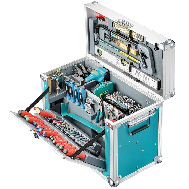 die Leichtbau-Werkzeugkiste bietet alles, was auf Montage von Bedeutung ist, durch die kompakten Abmessungen lässt sich die Kiste überall gut verstauen und die Leichtbauweise garantiert, dass die Kiste einfach transportiert werden kann, der Schultertraggurt und die Traggriffe erleichtern das Tragen zusätzlich, durch eine maximale Belastung von 100 kg, kann die Werkzeugkiste auch als Podest genutzt werden, genügend Platz für Elektrowerkzeuge, mit Vorhangschloss zu verschliessen, Schublade für Kleinteile oder Wertgegenstände