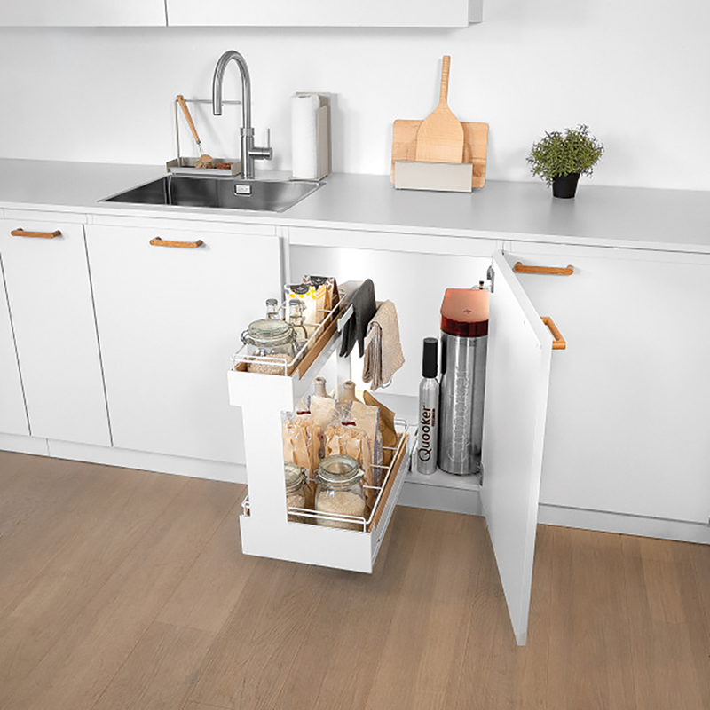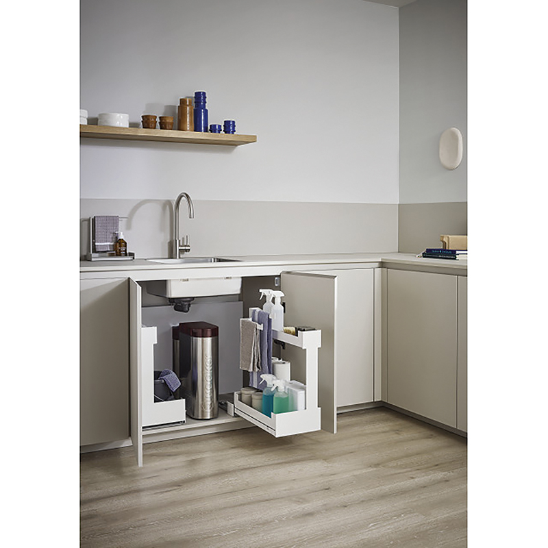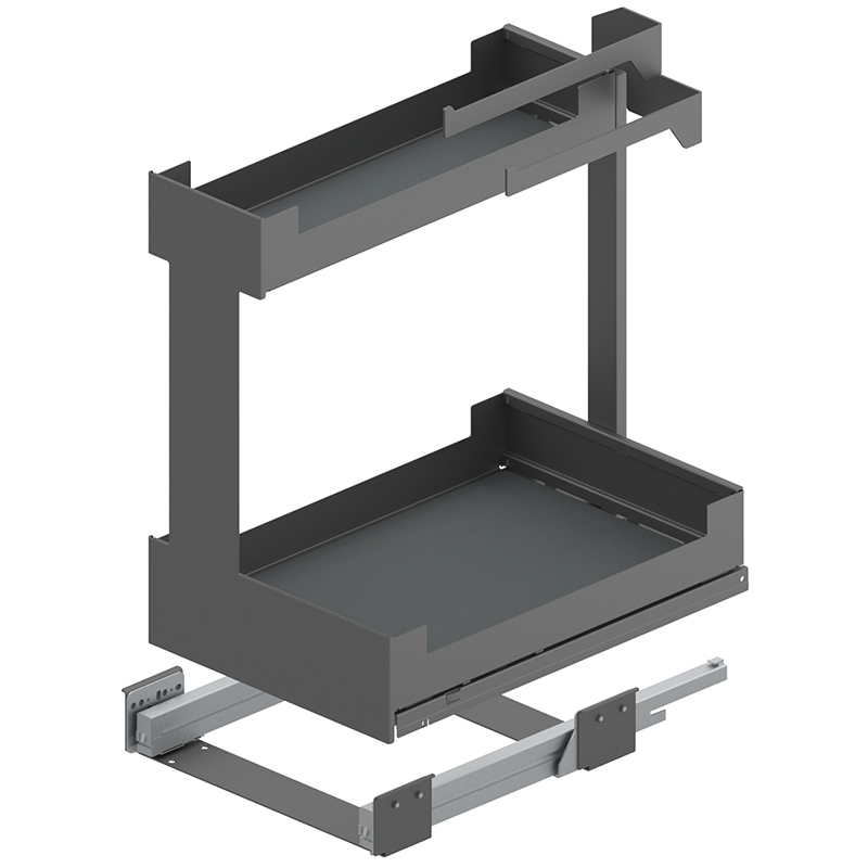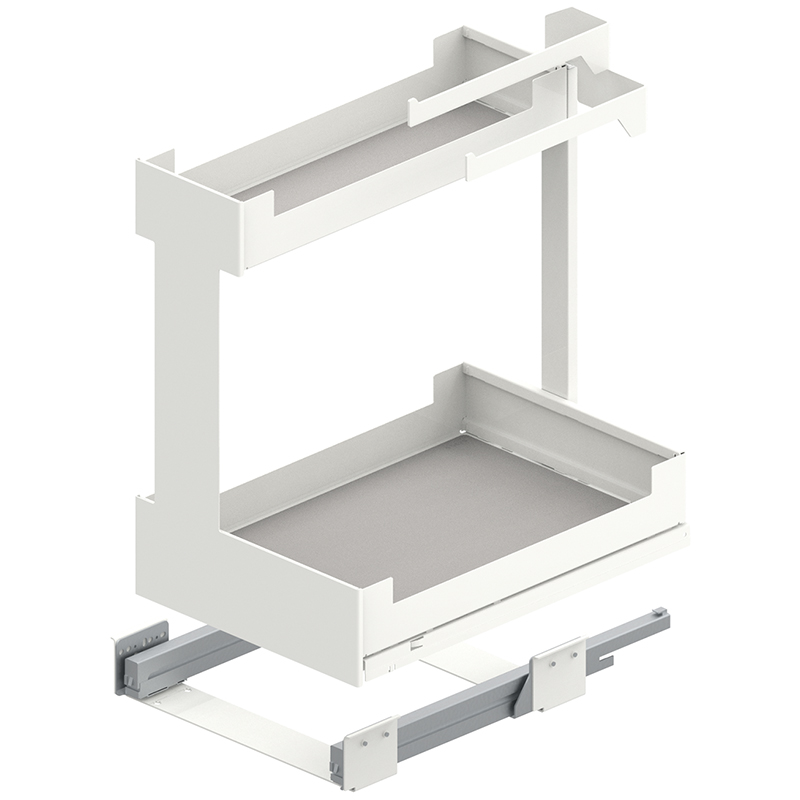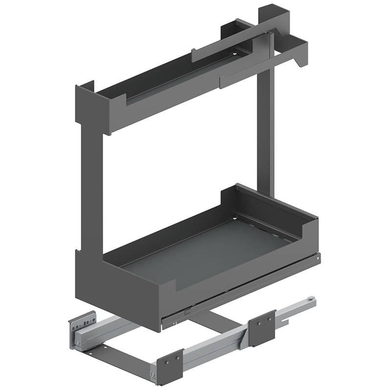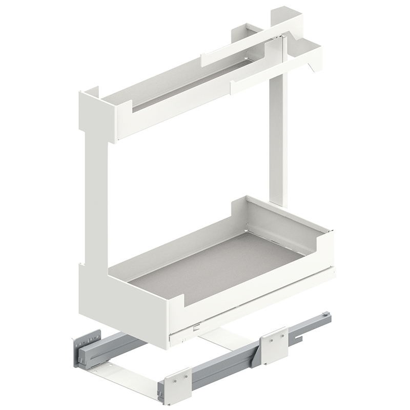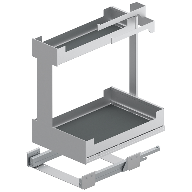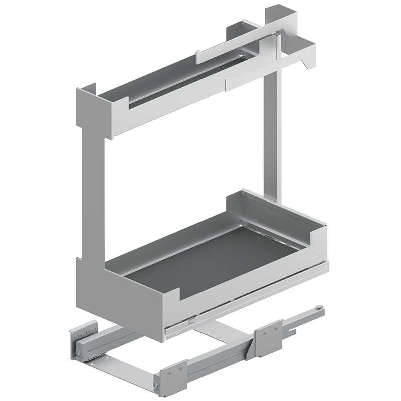 Stahlblech pulverbeschichtet, Vollauszug, integrierter Softclose, Frontauszug öffnen und Innenauszug mit 2 Etagen Staufläche herausziehen, Tragkraft 0 - 25 Kilo, mit Korpusschiene Nova Pro, ohne Relingeinsatz-Set