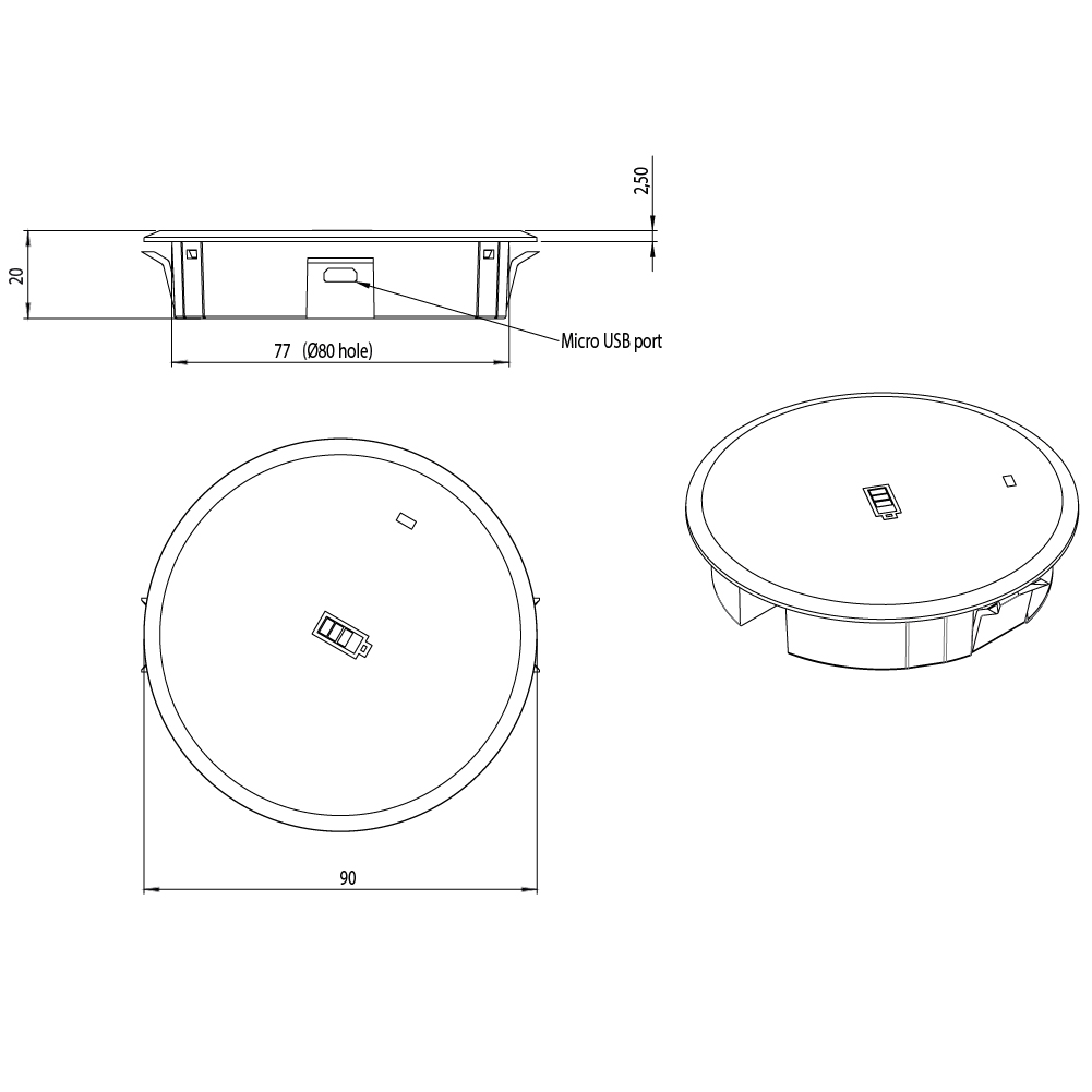 Qi-Ladeeinheit mit induktiver Ladespule für alle Qi-fähigen Smartphones, ermöglicht kabelloses Laden direkt im Möbel, zum flächenbündigen Einbau in Platten mit 19–25 mm Stärke, mit 15 W Ausgangsleistung und 9 V / 3 A Eingangsleistung für schnelles Laden, eine integrierte Statusanzeige informiert über den Ladevorgang, Passend für Einbaumass Ø 80 mm, ideal als Ersatz für herkömmliche Kabeldurchlässe, Aussenmass Ø 90 mm, Inklusive 1,5 m USB-Kabel und Netzstecker, schwarz