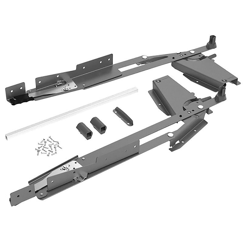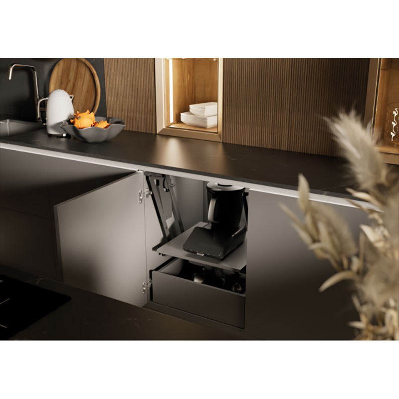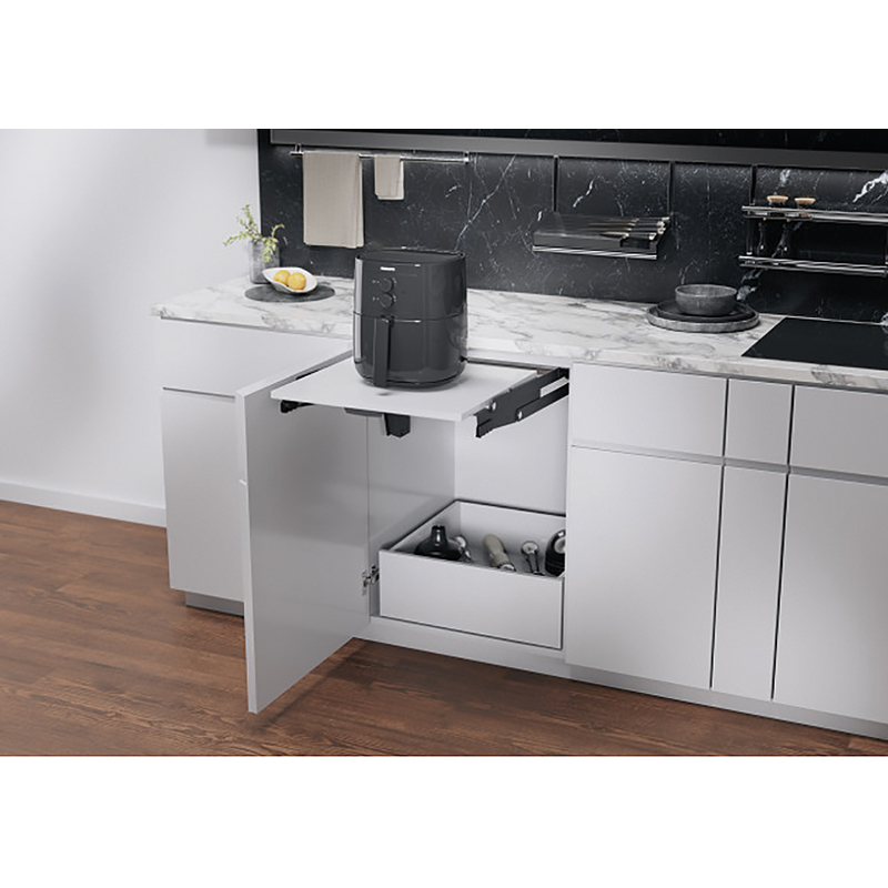 Trägerplatte hochschwenken und benutzen, automatische Arretierung durch seitliche Griffe wieder entriegeln und Platte hinunterschwenken, Küchengeräte nur unter Aufsicht auf der Trägerplatte laufen lassen Bitte beachten: Tragkraft beinhaltet auch das Gewicht der Trägerplatte