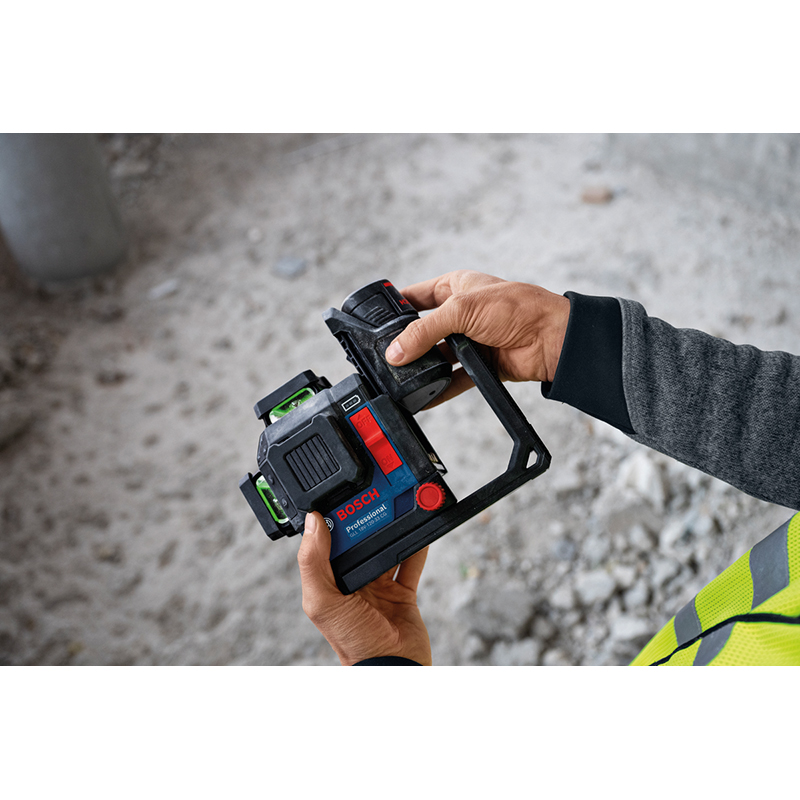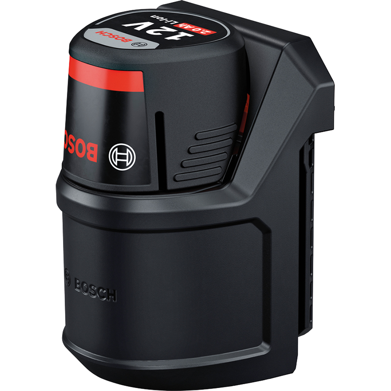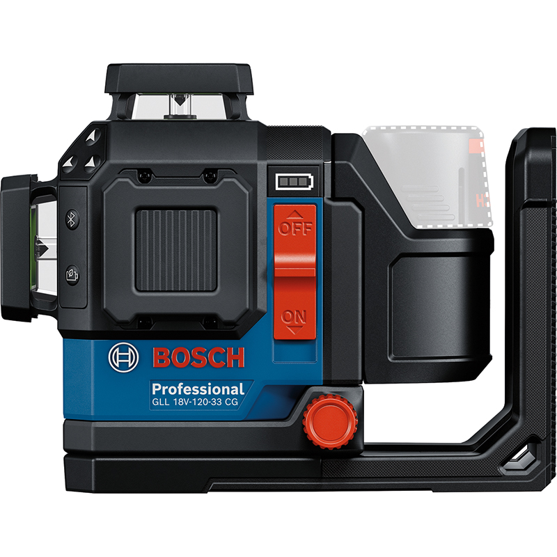 Flexibler Akku-Adapter für unterbrechungsfreies Arbeiten, höhere Flexibilität im Rahmen des Konzepts mit drei Stromversorgungen, das den Wechsel zwischen Bosch 18V- und 12V-Li-Ion-Akkus als auch Alkali-Batterien erlaubt, passend zum Bosch Linienlaser EXLL 18V-120-33 CG