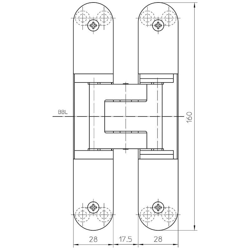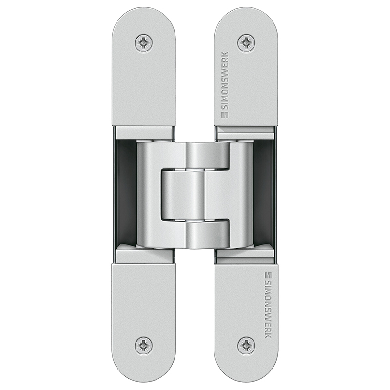 Grundmaterial bestehend aus Zinkdruckguss, Aluminium und Stahl, komplett verdeckt liegend, für ungefälzte Türen an Holz- und Stahlzargen, 3-dimensionale Verstellmöglichkeit, Seiten- und Höhenverstellung ±3 mm, Andruck ±1 mm, wartungsfreie Gleitlagertechnik, Öffnungswinkel bis 180°, Tragkraft bei 2 Band ca. 80 Kil