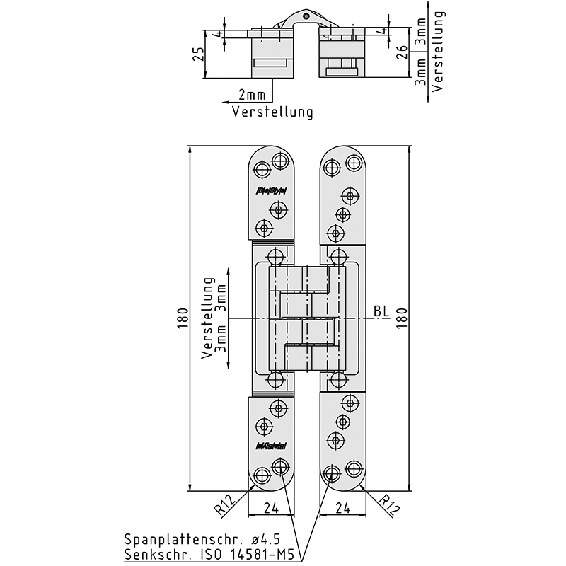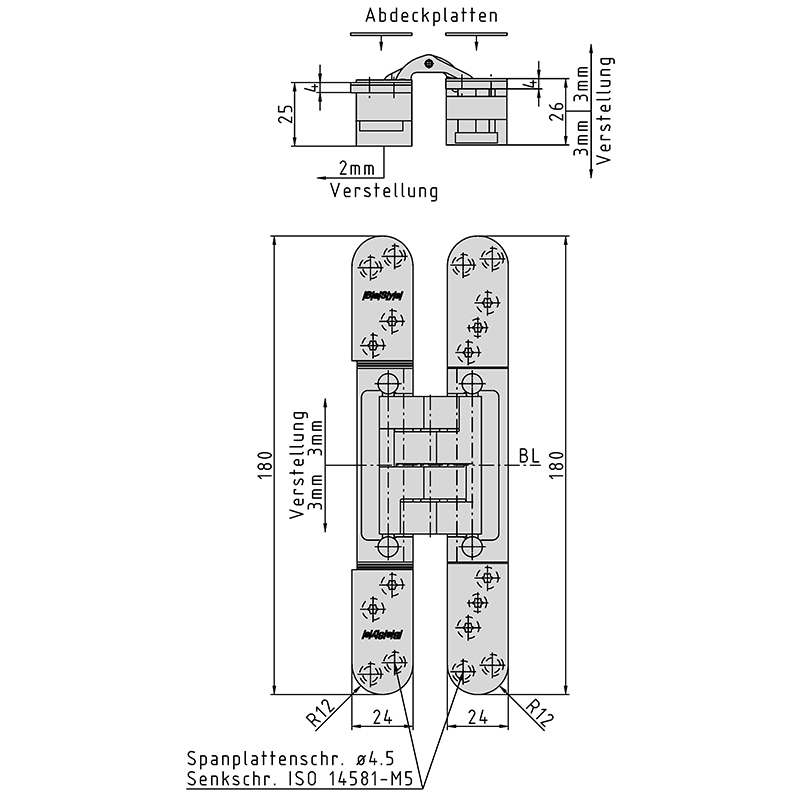Gehäuse Aluminium, Lappen Stahl, für stumpf einschlagende Türen, bei geschlossener Tür ist das Band unsichtbar, 3-dimensionale Verstellung, wartungsfreie Lagerungen, mit sichtbaren Schrauben oder Design-Ausführung, mit Befestigungsschrauben, Tragkraft bei 2 Band ca. 60 Kilo