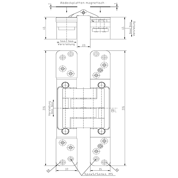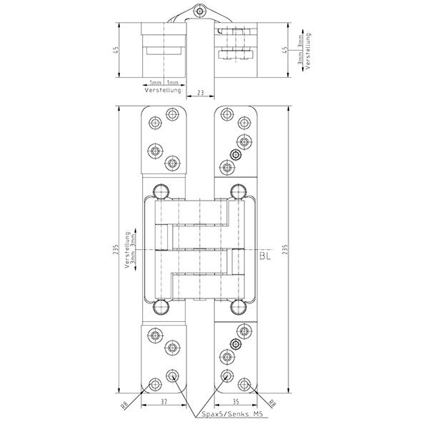 Gehäuse Stahl, Lappen Stahl, für stumpf einschlagende Türen, bei geschlossener Tür ist das Band unsichtbar, 3-dimensionale Verstellung, wartungsfreie Lagerungen, durch grosse Auslenkung für Aufdoppelungen geeignet, mit sichtbaren Schrauben oder Design, zur Verwendung an Türen in Flucht- und Rettungswegen mit Anforderungen an den Rauch- und Brandschutz, ohne Schrauben, Tragkraft bei 2 Band ca. 200 Kilo