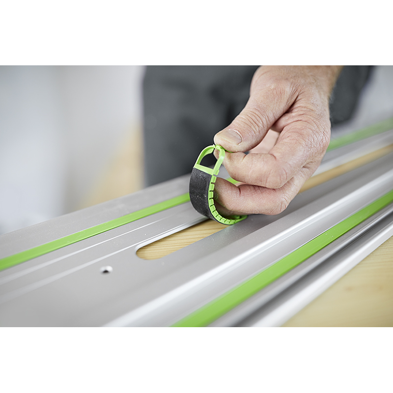 die Führungsschiene mit Klebepads, sicherer Halt, präzises und sicheres Sägen auch in schwierigen Lagen, praktischer Transport durch Aufstecken der Führungsschiene über den Tragegriff eines Systainers, ausrissfreier Schnitt, die Gummilippe direkt am Anriss verhindert das Ausreissen der Kanten selbst bei Winkelschnitten, Gleitbelag für leichtes Laufen der Maschine auf der Führungsschiene, Haftunterlage schützt die Werkstückoberfläche vor Beschädigungen
