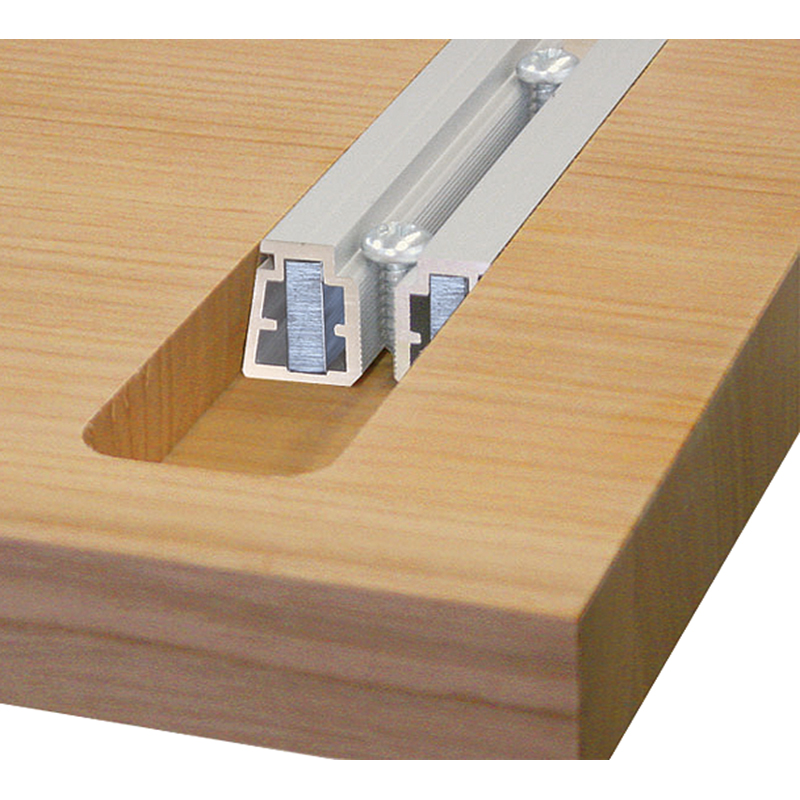 benötigt keine Ausfräsung an der Tischkante und kann auch nachträglich eingebaut werden, die Gratleiste ist zweiteilig und wird von oben in die Fläche eingesetzt, die gewünschte Länge wird selbst zugeschnitten, das Quellen und Schwinden der Holzplatte wird durch die Klemmmontage verhindert