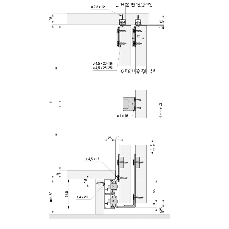 mit Abstützung des gesamten Türgewichts am Boden ermöglicht Schrankdesign mit geringen Materialstärken, leichter, flüsterleiser Lauf mit Eku Comfort Rolle,