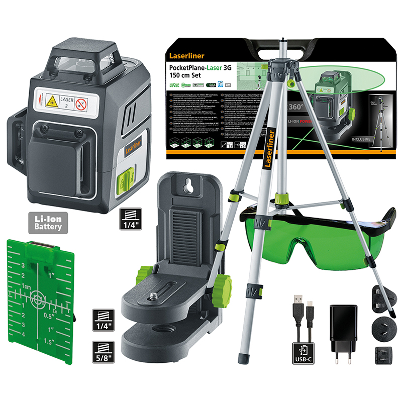 Lieferumfang: PocketWall Holder Halterung, Laser-Verstärkerbrille, magnetische Zielplatte grün, Li-Ionen-Akkupack, Netz-/ Ladegerät inkl. internationalem Adapter, Kompaktstativ 150 cm, Transportkoffer