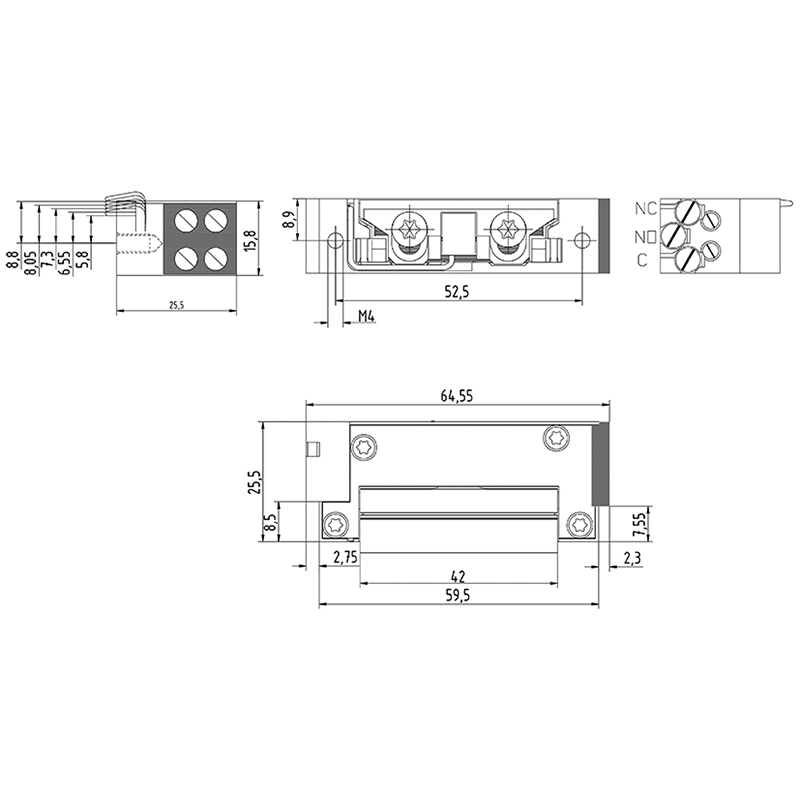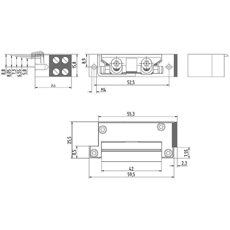 extrem kompakter Arbeitsstrom-Türöffner, speziell für Einfrässchliessblech E-1151. Betrieb mit Wechsel- und Gleichstrom möglich, Öffnergrösse: 62 x 16 x 25,5 mm, Radiusfalle 3 mm im 0,75 mm Raster verstellbar, Mit bipolarer EMV Schutzdiode, Falleneingriff-Tiefe 6,5 mm, Zuhaltekraft 3,5 kN, ohne Schliessblech