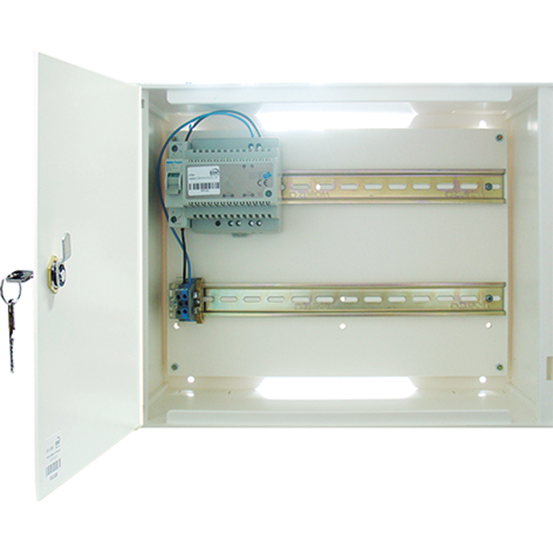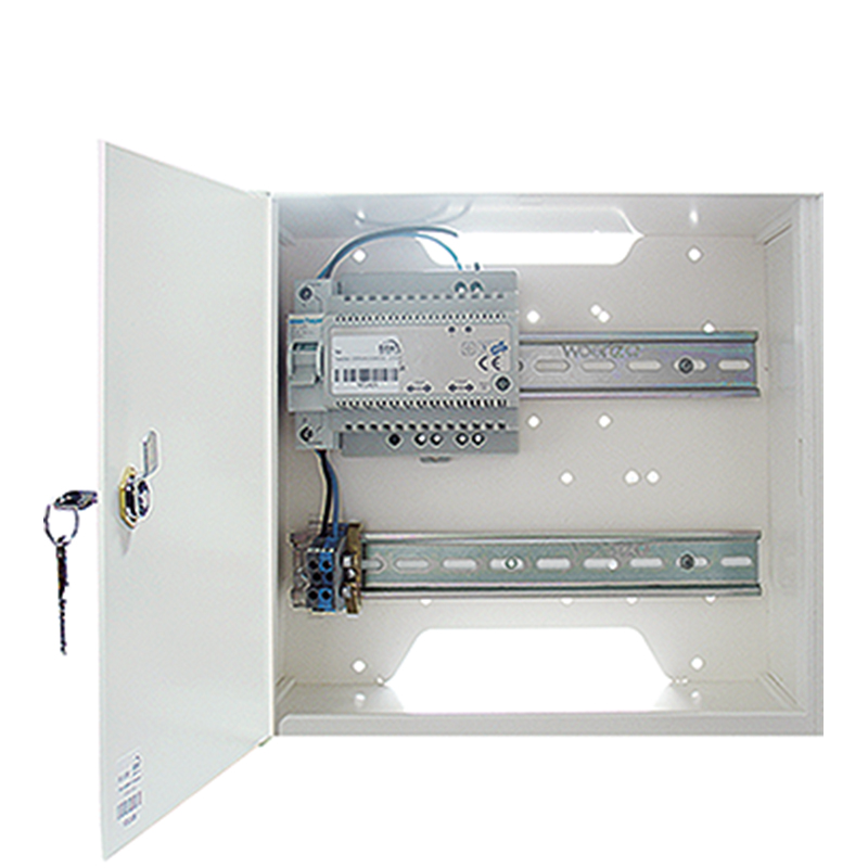 Gehäuse auf Putz mit Türe, Zylinder und DIN-Schienen, mit Netztrennschalter, Ein- / Ausgangsspannung: 100 - 240 Volt AC, 50 - 60 Hz / 12 oder 24 Volt DC ± 10% einstellbar,