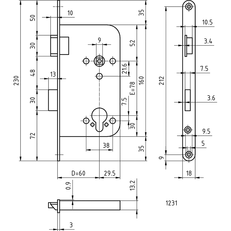 - Stahlfalle und Fallendämpfung, Stahlriegel 1-tourig, Riegelvorschub 13 mm,
