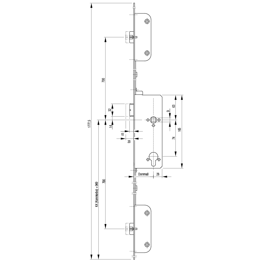 Drückerhöhe 949 mm, gesicherte Fallenfeststellung über den Zylinderein- und ausschaltbar, dadurch kann eine Tagesfreischaltung realisiert werden, nachrüstbar, vorgerichtet für A-Öffner, ohne A-Öffner