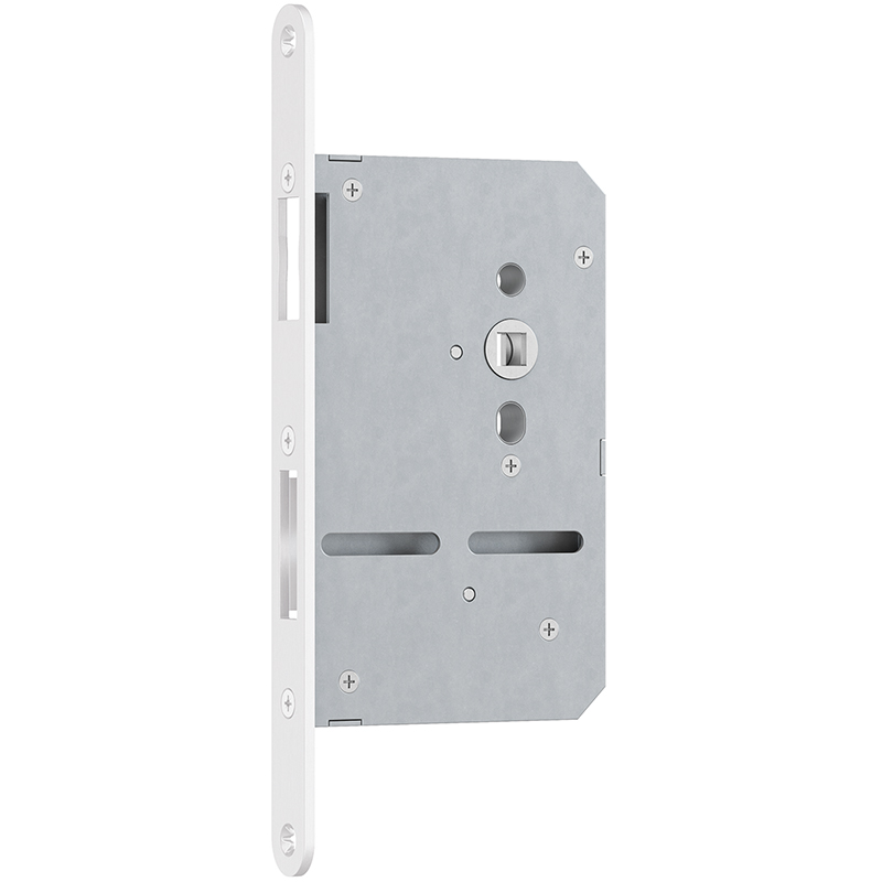 Edelstahl matt, konfigurierbarer Gegenkasten, mittiger Schlosskasten für geschraubte Stulpen, Drückerhochhaltung aktiv, Zwangsnuss 9 mm, 2 - 5 mm Spaltluft Überbrückung, Rückstossgesicherte Verriegelungsstangen, ohne Stulp, geprüft nach EN 179, EN 1125, EN 1634, EN 12209Anwendungsgebiet: