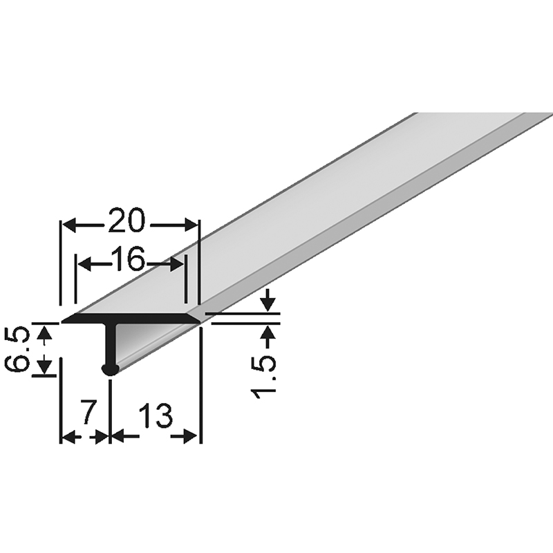 Aluminium silber eloxiert, als Übergang von angrenzenden, vollflächig verklebten Bodenbelägen, das 20 mm Profil deckt auch, wenn auf der einen Seite ein Bodenbelag schwimmend verlegt ist, eine hervorragende Alternative zu Silikonfugen, kein Verschmutzen und Absacken, die Montage erfolgt punktuell oder auf die ganze Länge mit Montagekleber, Dichtungsmasse oder dem speziell dafür konstruierten Lamellendübel