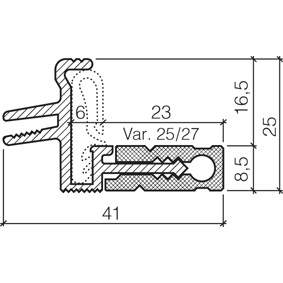 Aluminium, ungebohrt, 2-teilige Thermoschwelle, Grundprofil mit grauem Kunststoffisolator, verstellbar für Falzbreiten von 23, 25 und 27 mm, Steckprofil zum Einclipsen, bei Falztiefe 23 mm beträgt die Profilbreite 98 mm, rollstuhlgängig