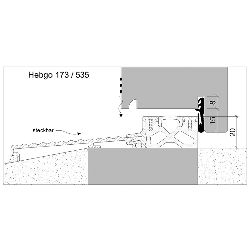 Aluminium, ungebohrt, 2-teilige Thermoschwelle, Grundprofil mit grauem Kunststoffisolator, Deckleiste aus TPE, Einsatz von Schleifdichtungen und Absenkdichtungen möglich dank der entfernter "Nase", mit Dichtungsnut für einsteckbare Rundschnur unter dem Schwellenprofil, erfüllt SIA-Norm 271, Steckprofil zum Einclipsen, rollstuhlgängig