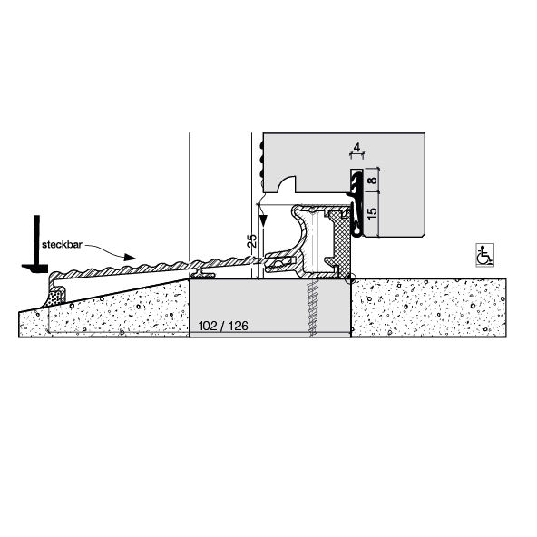 Aluminium, ungebohrt, 2-teilige Thermoschwelle, Grundprofil mit grauem Kunststoff-Isolator, Steckprofil zum Einclipsen, rollstuhlgängig