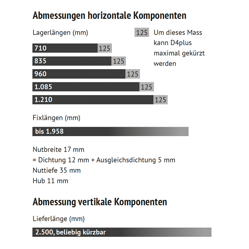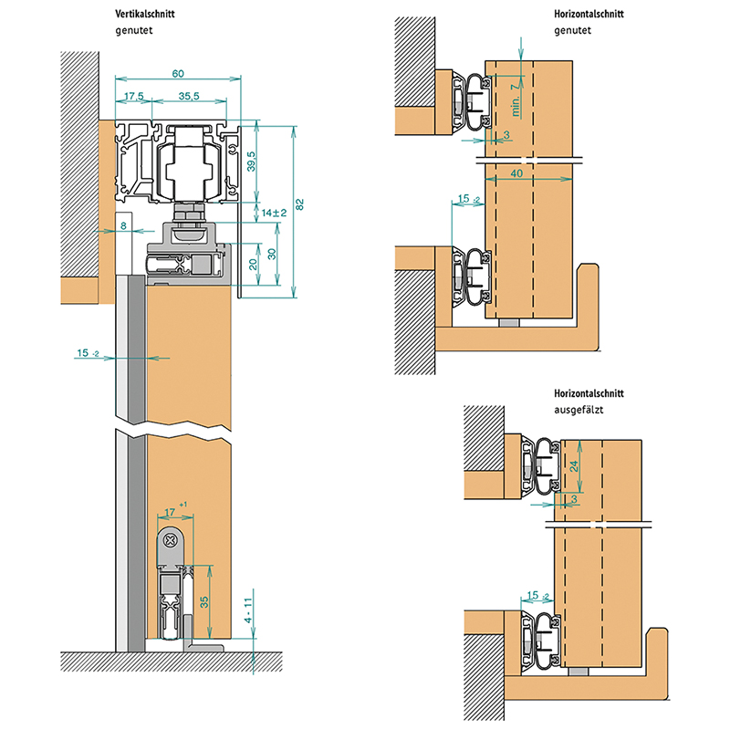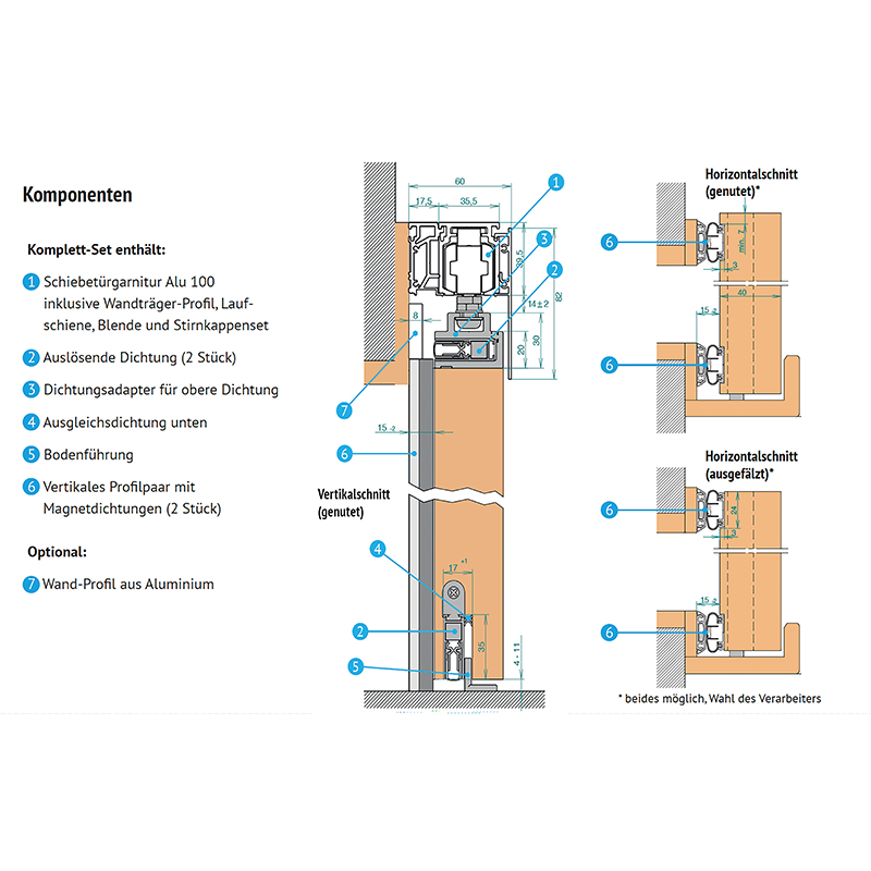 Aluminium F1 eloxiert, Schalldämmwert bis 36 dB (geprüft mit Türblatt mit Schalldämmwert 42 dB Rw), Laufrollen aus Spezialkunststoff mit Präzisionskugellagern, obere und untere Dichtung mit einseitiger Auslösung, geeignet für Schiebetüren aus Holz mit einer Breite von 585 bis 1958 mm und einem Gewicht bis zu 100 kg, für Türstärke 40 mm, Nutbreite der unteren Dichtung 17 mm inklusive Ausgleichsdichtung, Nuttiefe 35 mm, Hub 11 mm, Dichtungsadapter mit Schraube M8, Einstellung der Dichtung ohne Werkzeug, wartungsfrei, korrosionsgeschützte Bauteile, obere und untere Dichtung mit Profil aus Aluminium und Dichtprofil aus selbstverlöschendem Silikon, vertikale Dichtungen mit Magnetsystem, Profil aus Aluminium und Dichtprofil aus selbstverlöschendem Silikon, Wandträger-Profil, Laufschiene, Blende und Stirnkappenset
