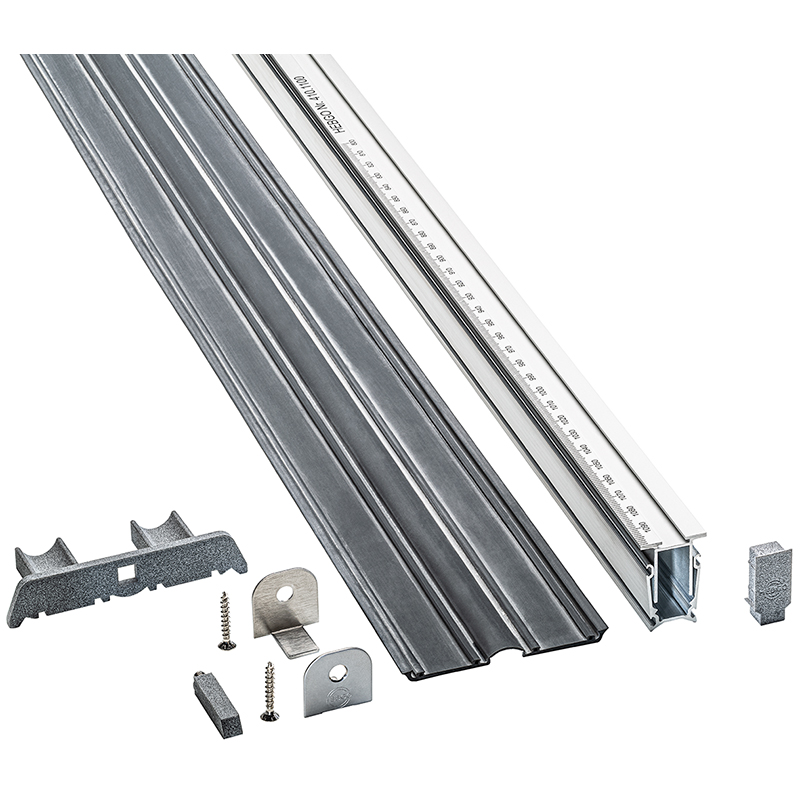 Befestigungsmaterial (seitliche Befestigungslaschen), Kürzhilfe, Auslöseknopf und Abschlusskappen
