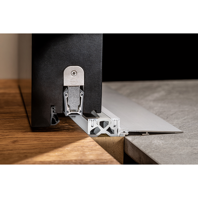automatische Türabsenkdichtung für Haustüren, Renovationen und Neubauten, abgestimmt und optimiert mit Hebgo Thermoschwellen, einseitige Auslösung, automatischer Ausgleich bei schiefen Böden, parallele Absenkung, höchster Schlagregenschutz mit speziellen Eckdichtungen, Kürzen ohne kompliziertes Zerlegen der Absenkdichtung, aufgelaserte Skala zum einfachen Kürzen, Kürzhilfe für geraden Schnitt der Silikondichtung, Einsatz auf für doppelflüglige Türen geeignet, einfaches Auswechseln des Dichtbandes ohne Zerlegung der Absenkdichtung