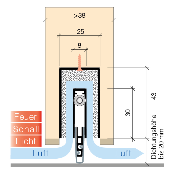 automatische Türabsenkdichtung für gefälzte Türen mit hohem Luftdurch- lass und Schallschutzanforderungen in Minergie-, Niedrigenergie- und Passivhaus mit kontrollierter Lüftung, bandseitige Auslösung mit Parallelabsenkung und automatischem Ausgleich bei unebenem Boden, Dichtungshöhe bis 20 mm, mit Silikon-Rundlippe, Luftdurchlass 200 qm/h, Messwert 30 qm/h bei Druckdifferenz von 3,9 Pa und Lüftungslänge 1050 mm, Schalldämmwert bis max. 27 dB, bei Bodenabstand 7 mm, mit Montageset für seitliche Befestigung