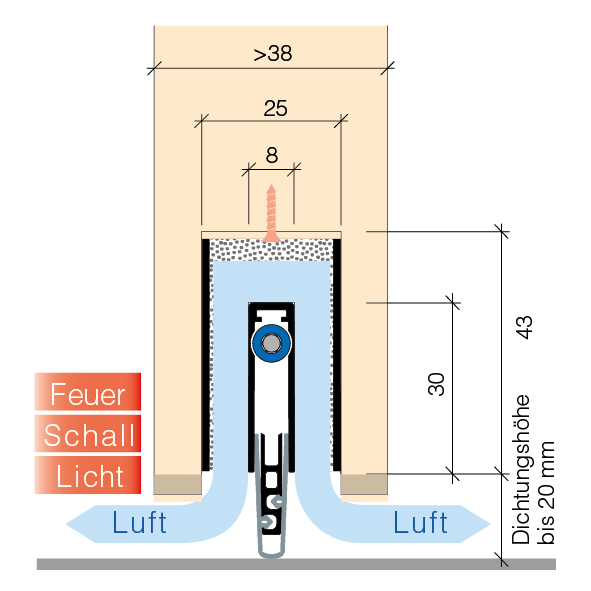 bandseitige Auslösung mit Parallelabsenkung und automatischem Ausgleich bei unebenem Boden, Dichtungshöhe bis 20 mm, mit Silikon-Rundlippe, Luftdurchlass 250 qm/h, Messwert 40 qm/h bei Druckdifferenz von 3,2 Pa und Lüftungslänge 1050 mm, Schalldämmwert 23 dB, bei Bodenabstand 7 mm, mit Montageset für seitliche Befestigung