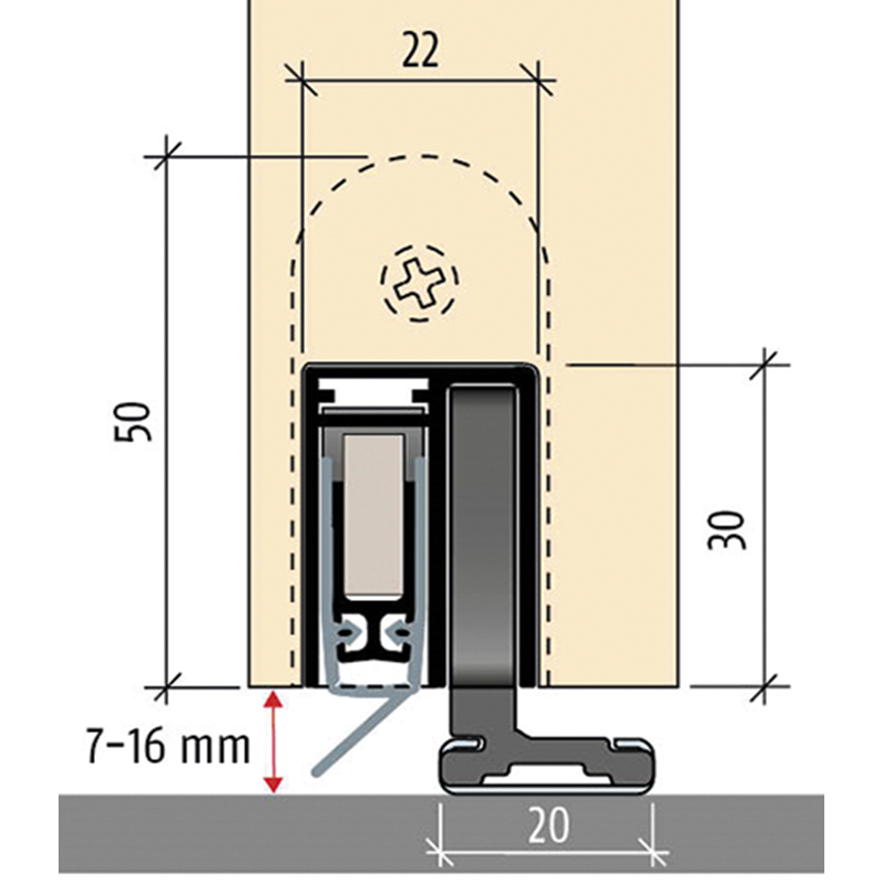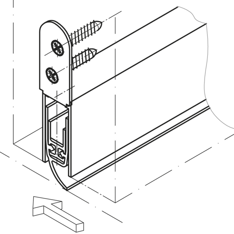 automatische Türabsenkdichtung für Schall- und Rauchschutz-Schiebetüren, Auslösung durch Bodenführung mit Parallelabsenkung, zum Einnuten bündig, Dichtungshöhe bis 7 - 16 mm, Lippe aus Silikon, Schalldämmwert bis 44 dB, seitliche Befestigung, mit Bodenführung