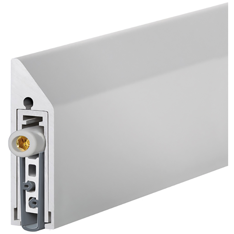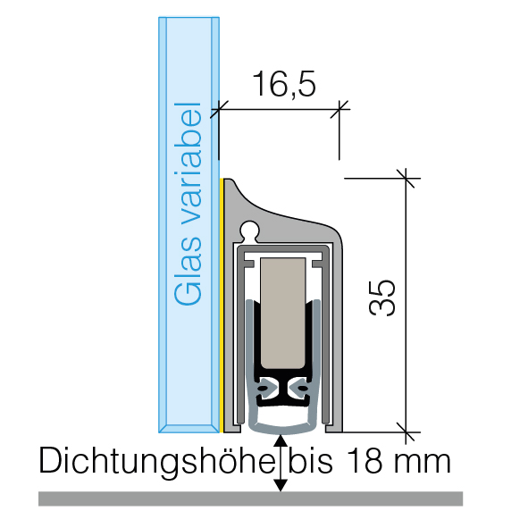 Aluminium, automatische Türabsenkdichtung im eleganten Design, ideal für nachträgliches Abdichten von Glas-, Metall-, Aluminium- und Holztüren, bandseitige Auslösung mit Parallelabsenkung und automatischem Ausgleich bei schiefem Boden, einfachste Montage mit Klebebandset, Dichtungshöhe bis 18 mm,