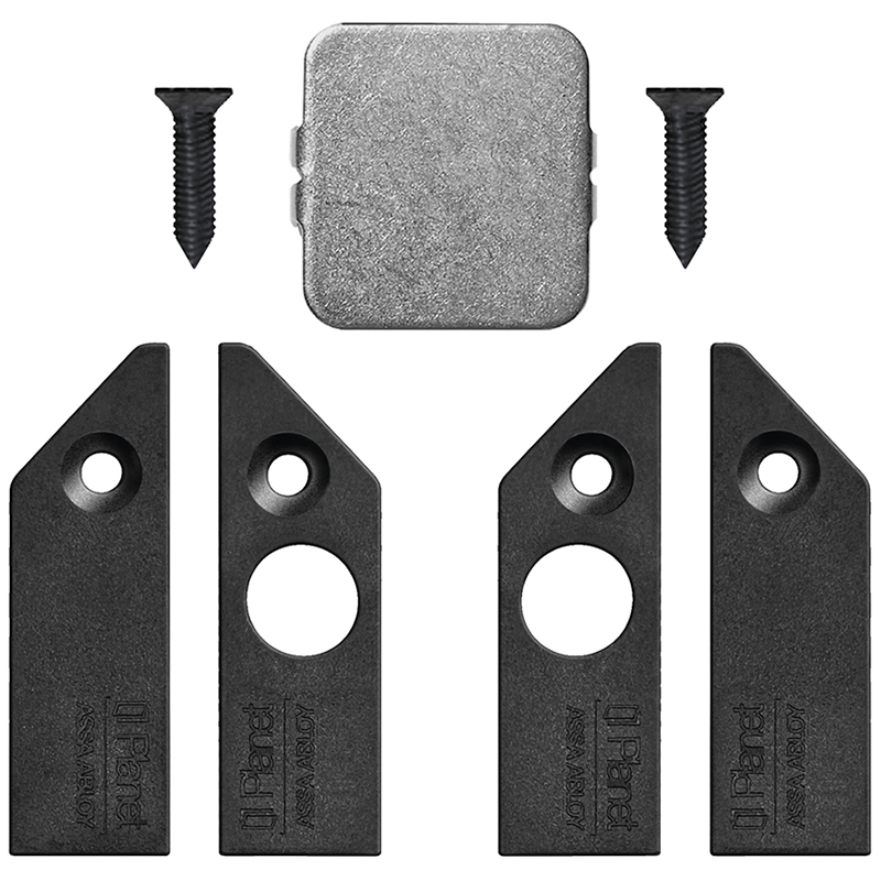 Set bestehend aus: je 1 Schutzprofil mit vorgerichtetem Doppelklebeband, Türabsenkdichtung, Folie alufarbig, Auflaufplättchen, Inbusschlüssel, Montagekleber und 2 Abdeckplatten, mit Montageanleitung