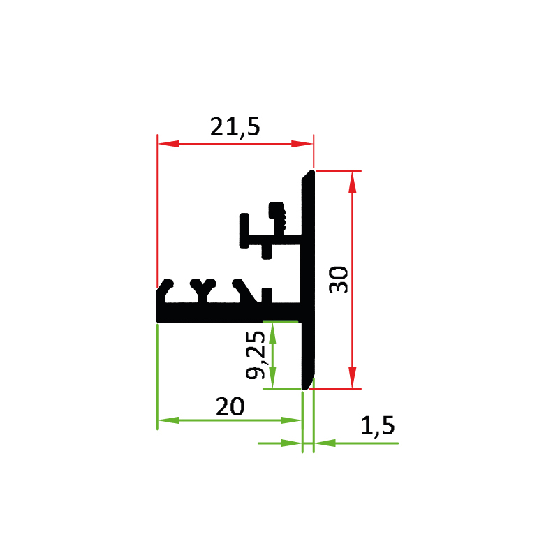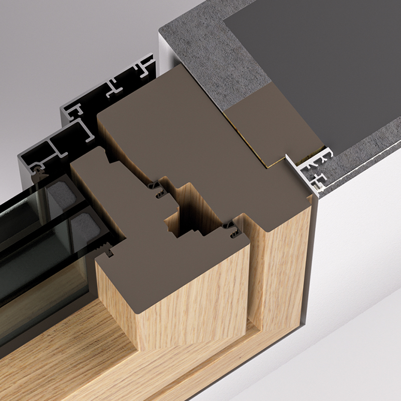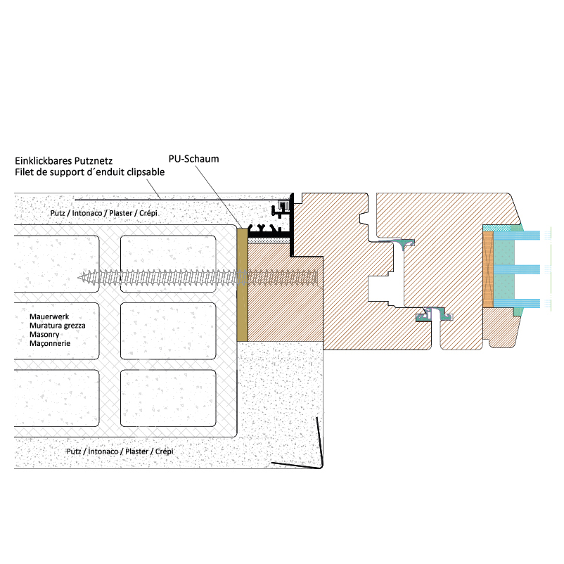 Aluminiumprofile für wandbündige Fenster-, Einbau-, und Küchenelemente, Profil wird auf das Blindfutter geklebt und gewährleistet dadurch eine Entkoppelung der gesamten Vibrationen, die abgeschrägte Kante gewährleistet perfekte Kantenausbildungen und filigrane Schattenfugen, perfekte Putz- und Trockenbauanbindung durch das in das Zargenprofil einklickbare Putznetz, dadurch entsteht eine feste Verbindung zwischen Türzarge und Mauerwerk/Trockenbau und verhindert somit Haarrissbildungen