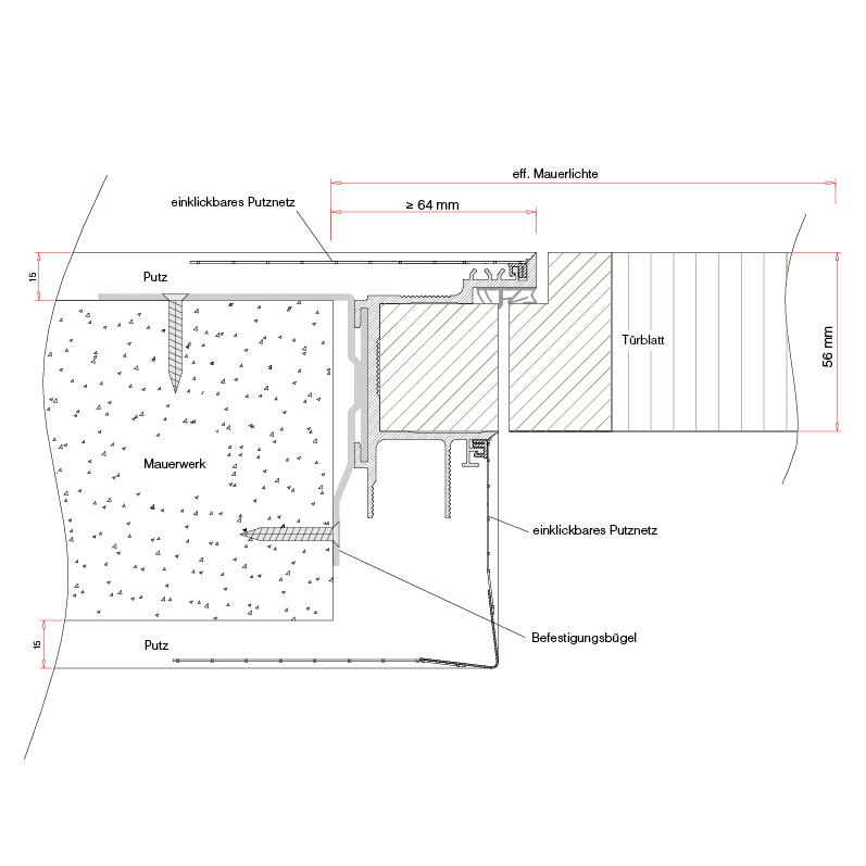 konfektionierte Aluminiumprofile für wandbündige Türkonstruktionen mit perfekter Kantenausbildung und filigraner Schattenfuge, ohne Probleme mit Haarrissbildung, die mit einer unästhetischen Acrylfuge verschlossen werden müsste, das mitgelieferte Putznetz wird in das Zargenprofil eingeklickt und stellt somit eine feste Verbindung zwischen Türzarge und Mauerwerk / Trockenbau her, für eine schnelle und fachgerechte Montage sind Montagebügel und Eckverbinder vorgesehen, mit Montageanleitung