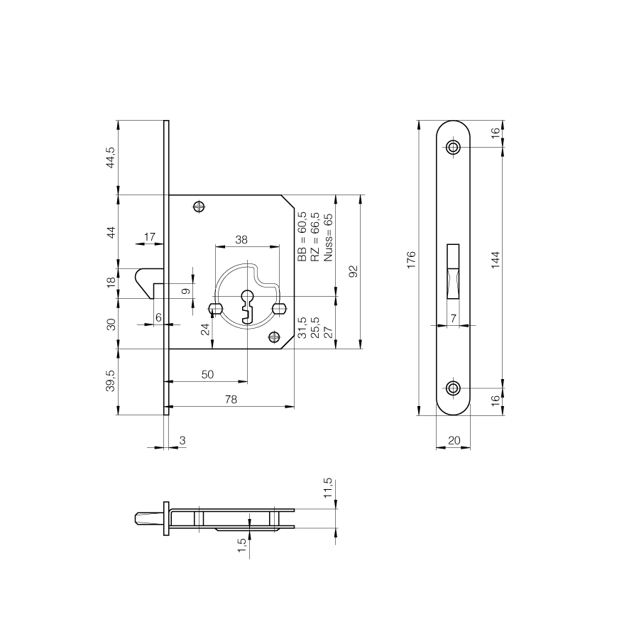 Schiebetür-Einsteckschloss SCHÄNIS 1605, mit Rundstulp 20 x 176 mm