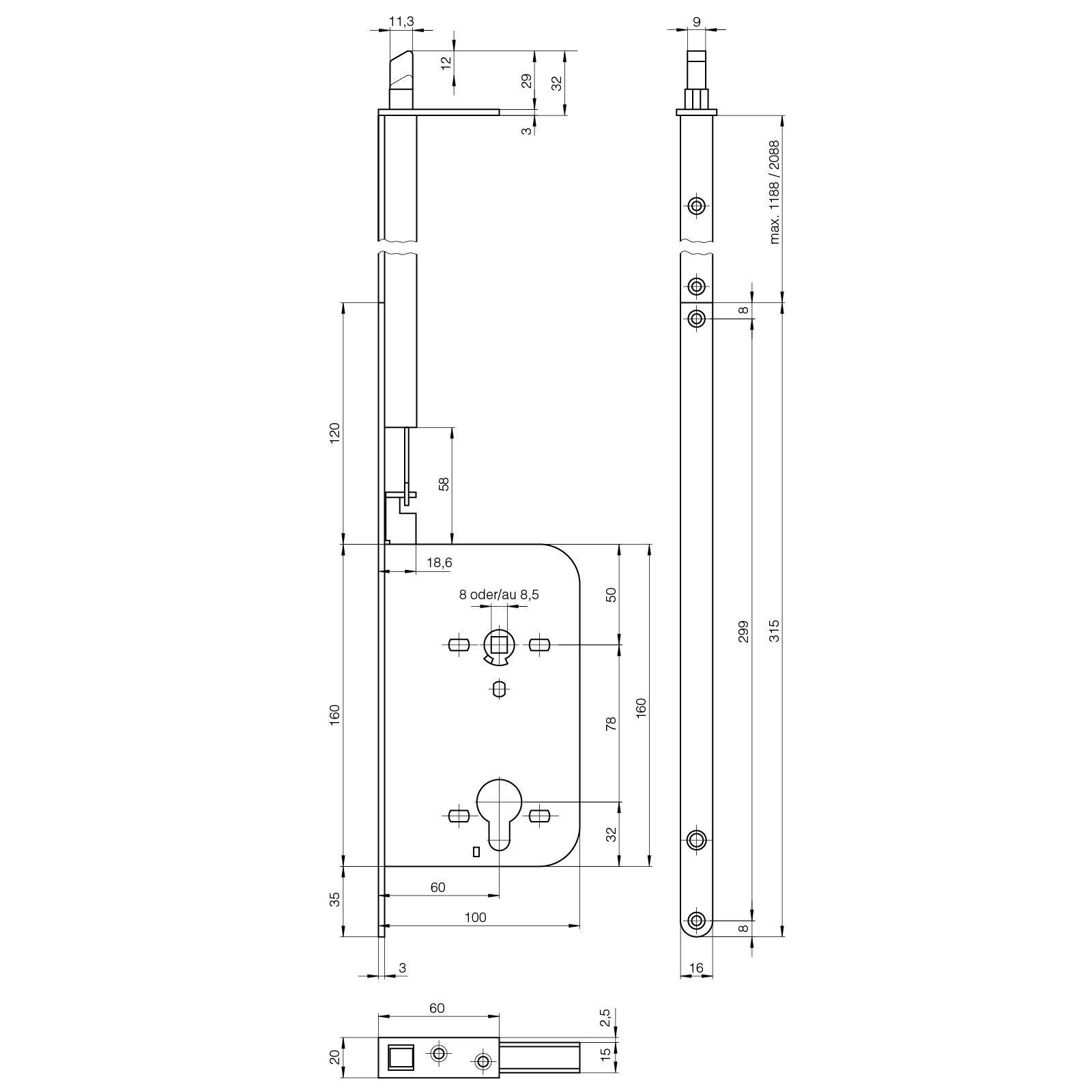 - Nur mit Verriegelung nach oben, dadurch kann auf der Tür-Stirnseite ein Handschutz-Gummiprofil durchgehend eingenutet werden.