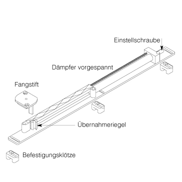 zum Befestigen am oberen Rahmenprofil, mit Selbstschliessfunktion, bestehend aus Dämpfungselement, 3 Holzklötze, Fangstift und Schrauben