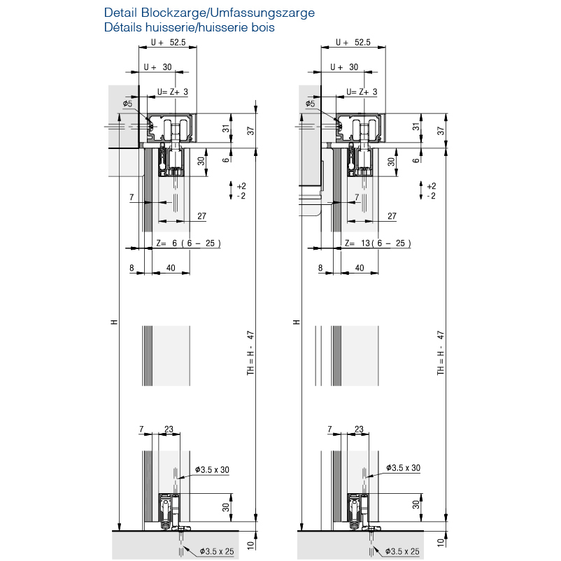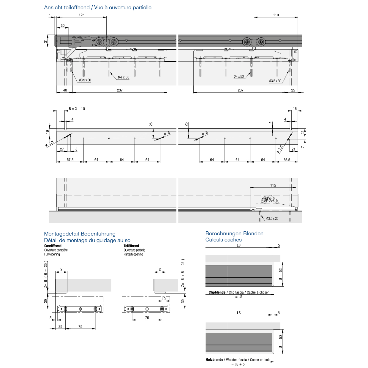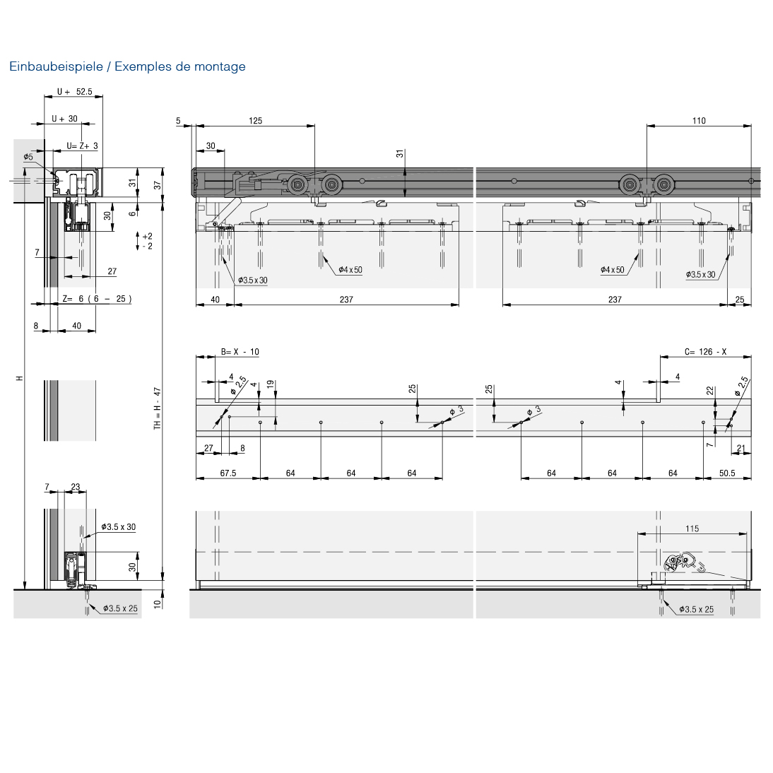 Beschlag für oben laufende Holztüren, mit aufgesetzter Laufschiene, Wandmontage, minimale Einbauhöhe, hoher Wohnkomfort dank wirksamer Dämmung von Schall, Zugluft, Gerüchen und unerwünschtem Lichteinfall, bis zu max. 39 dB (Dämmwert ist abhängig von gesamter Konstruktion), ohne Laufschiene, ohne Dichtungsgarnitur