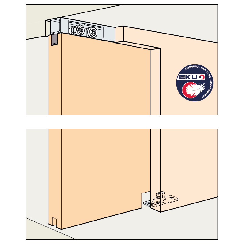 für Deckenmontage, Einbau in der Tasche, höhen- und seitenverstellbar, Laufwerke mit Gleitlager- bzw. Kugellagertechnik und Kunststoffrollen, ohne Laufschiene, ohne Zubehör