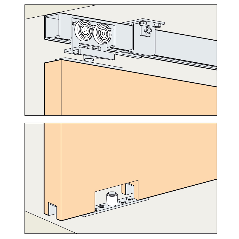 für Decken- und Wandmontage, höhen- und seitenverstellbar, Laufwerke mit Kugellagertechnik und Kunststoffrollen, ohne Laufschiene, ohne Zubehör
