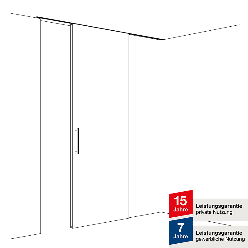 Beschlag für oben laufende Holztüren bis 100 kg, mit aufgesetzter oder deckenbündiger Laufschiene, barrierefreies Öffnen, wahlweise mit SoftStop und/oder Dämpfeinzug SoftMove, Wand- oder Deckenmontage, ohne Laufschiene
