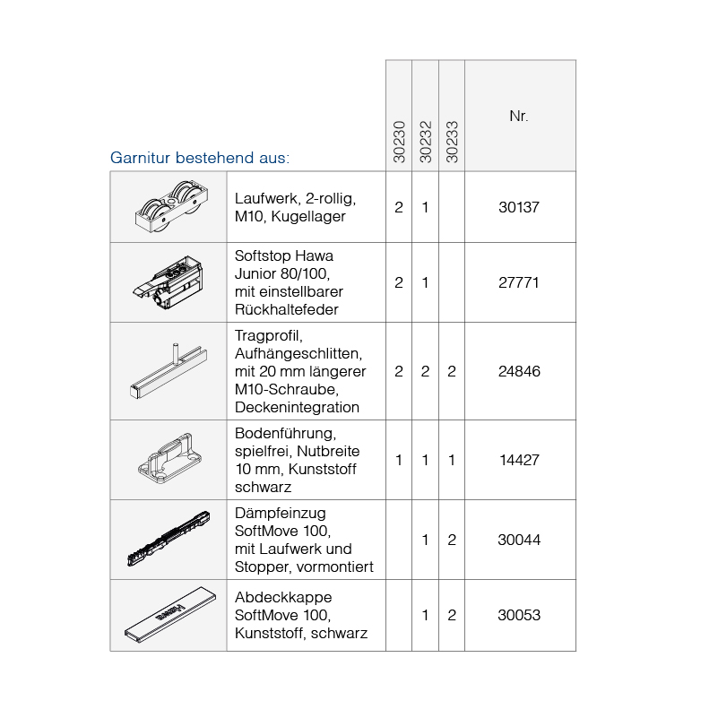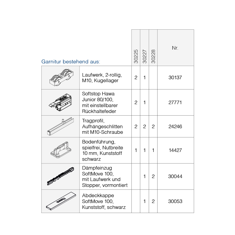 Schiebetürbeschlag Holz, Komplett-Garnitur HAWA Junior 100 B