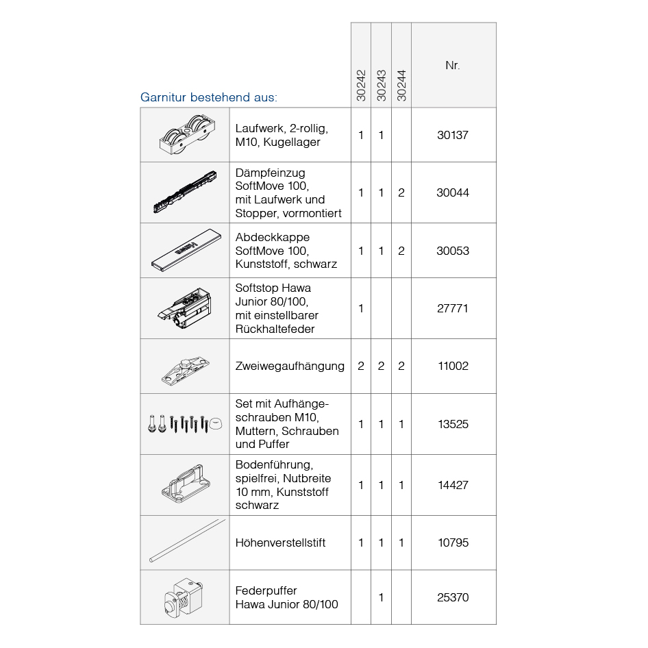 Schiebetürbeschlag Holz, Komplett-Garnitur HAWA Junior 100 Z / Z Pocket