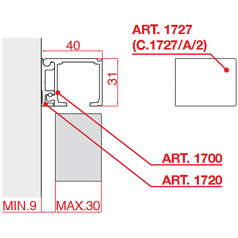 Laufschiene 1700 mit Wandhalterprofil 1720 und Abdeckprofil 1890