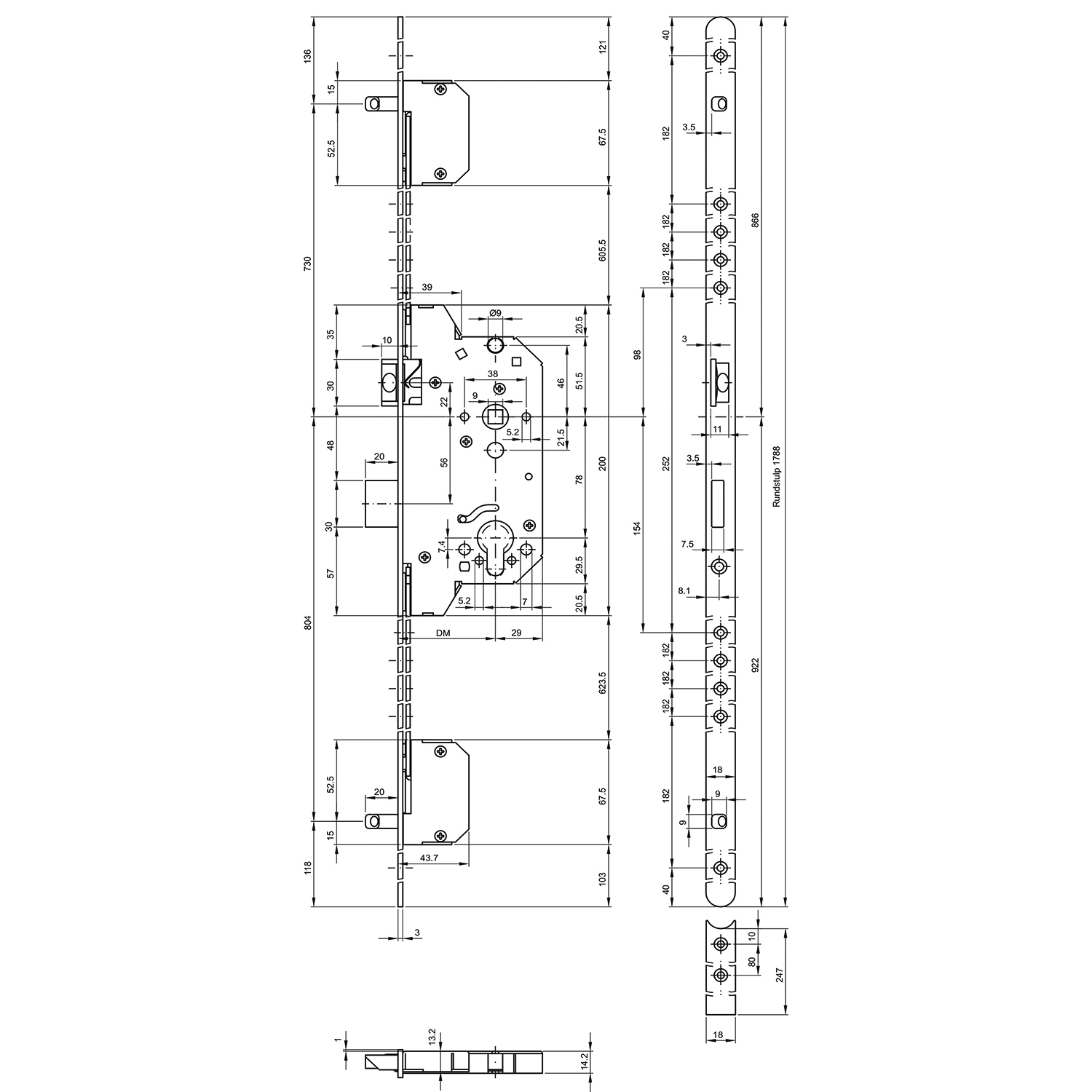 4-Punkt-Verriegelung durch Hauptriegel, 2 Riegelfallen und Fallenblockierung, mit Zwangsnuss, mit Delrinfalle, Riegel- und Bolzenvorschub 20 mm, 1-tourig, Riegel aus gehärtetem Spezialstahl, mit Wechselfunktion