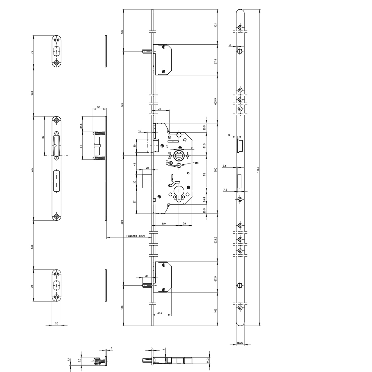 4-Punkt-Verriegelung durch Hauptriegel, 2 Verriegelungsbolzen und Fallenblockierung, Schlüssel- oder Drückerbedienung einstellbar, mit Zwangsnuss 9 mm, mit Delrinfalle, Riegel- und Bolzenvorschub 20 mm, 1-tourig, aus gehärtetem Spezialstahl, mit Wechselfunktion, mit Schliessblechset
