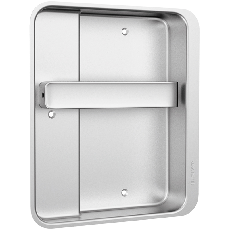Edelstahl matt, flächenbündiger Drücker für Türen in Sporthallen, Schiebetüren, Schlupftüren und Brandschutztüren, geeignet für Fluchttüren nach EN 179, geringe Einbautiefe im Schlossbereich durch zweistufiges Design, ohne Vierkantstift, ohne Schrauben