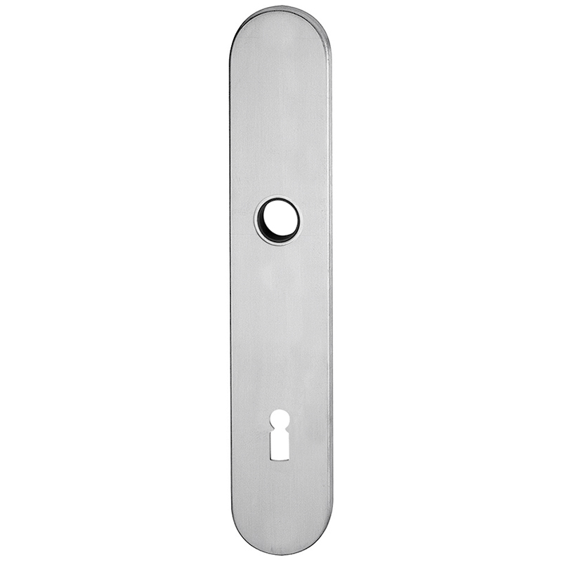 Edelstahl matt, mit Drückerführung glide einwärts 16 mm, Grundplatte innen mit 2 Führungsnocken, aussen mit Gewindenocken M4, Mitte Drückerführung bis Mitte unterer Gewindenocken 125 mm, ohne Schrauben