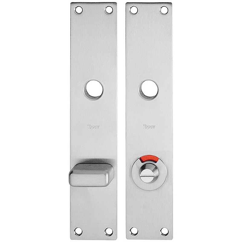 Edelstahl matt, mit Drückerführung einwärts gezogen 16 mm, WC-Langschild aussen mit Münzschlitz-Notöffnung, innen mit Dreholive, Mitte oberes Schraubenloch bis Mitte Drückerführung 68 mm, ohne Schrauben