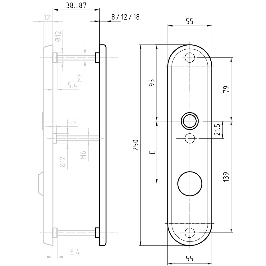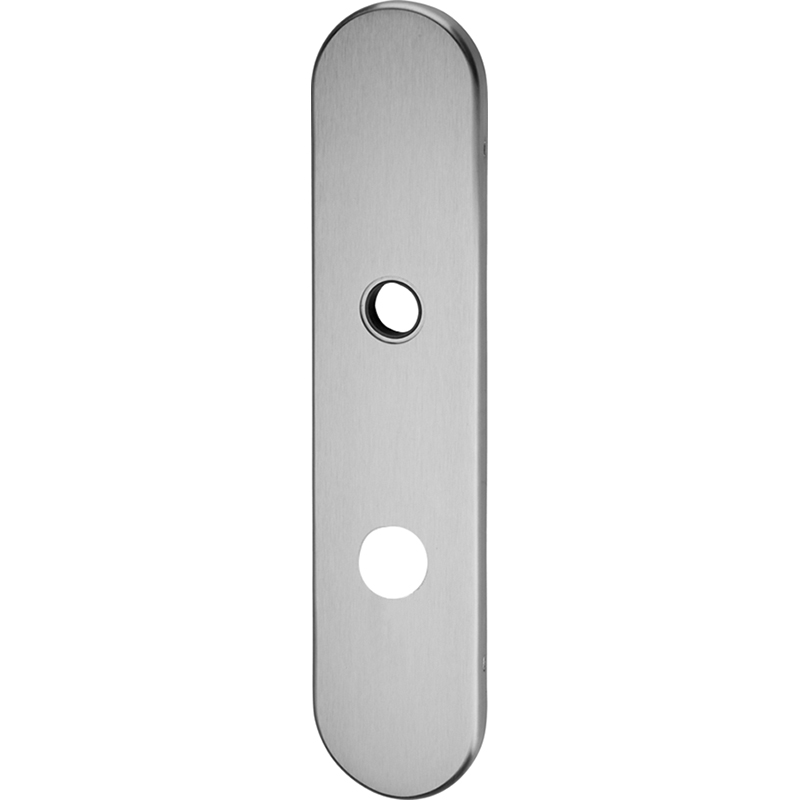 Grundplatte Stahl verzinkt mit 3 Schraubenlöcher M6, mit Clip-Abdeckung Edelstahl matt, Drückerführung bündig, Führung 16 mm für Drücker mit Hals-Ø 20 mm, Mitte oberes Schraubenloch bis Mitte Drückerführung 79 mm, ohne Schraubenset