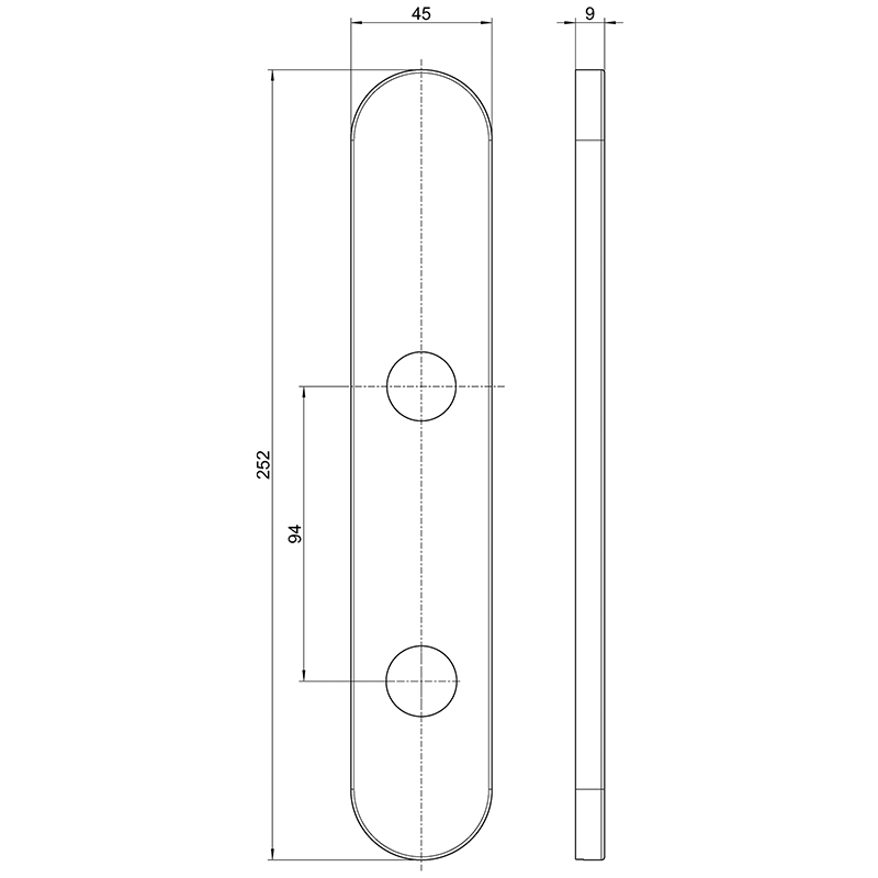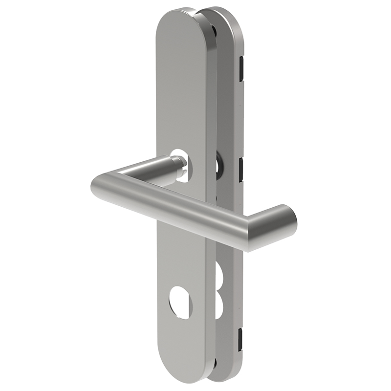 Edelstahl matt, Drücker-Lochteil 9 mm lose auf Langschild aufsteckbar, Langschild mit Drücker-Hochhaltefeder, 3 Schraubenlöchern und Clips-Abdeckung, Schildgrösse 45 x 252 x 9 mm, Drücker 145 mm, Ausladung 70 mm, links und rechts verwendbar, Panik-Garnitur bestehend aus 2 Drücker-Lochteil und 2 Langschilder und Vierkantstift