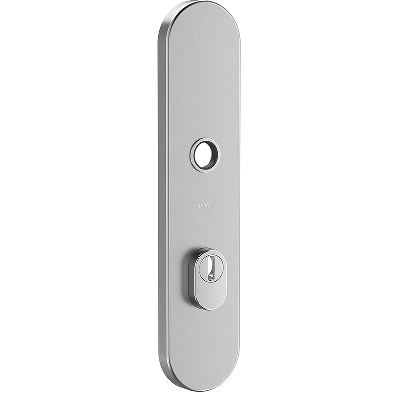 Oberfläche Edelstahl matt, mit 3 Gewindenocken, für paarweise Verschraubung mit Innenschild 58540, einsetzbar an einbruchhemmenden Türen RC4 / ES3, kombinierbar mit allen Glutz Drücker mit Hals-Ø 18 - 22mm oder mit Oval-Stanzung für Knopffestmontage, geprüft nach EN 1627-1630, mit Zylinderabdeckung RZ-ZA 9-15 mm / PZ-ZA 9-16 mm, ohne Schraubenset
